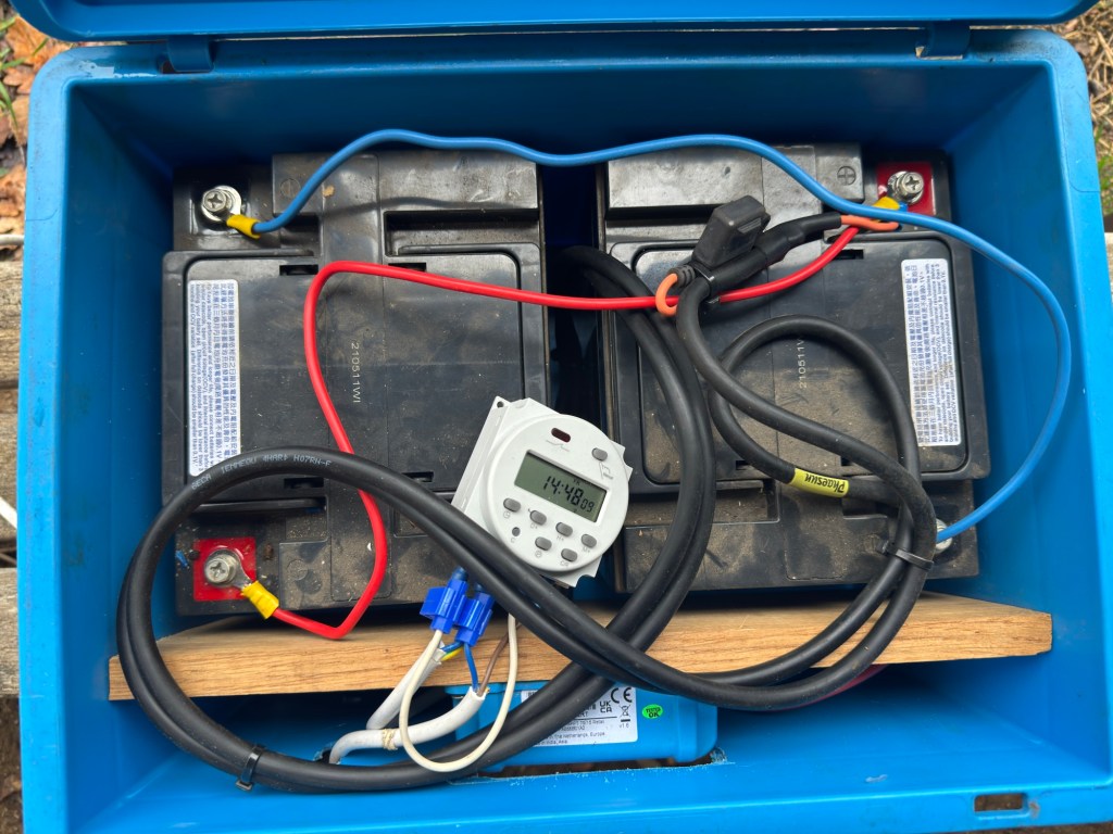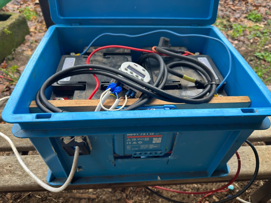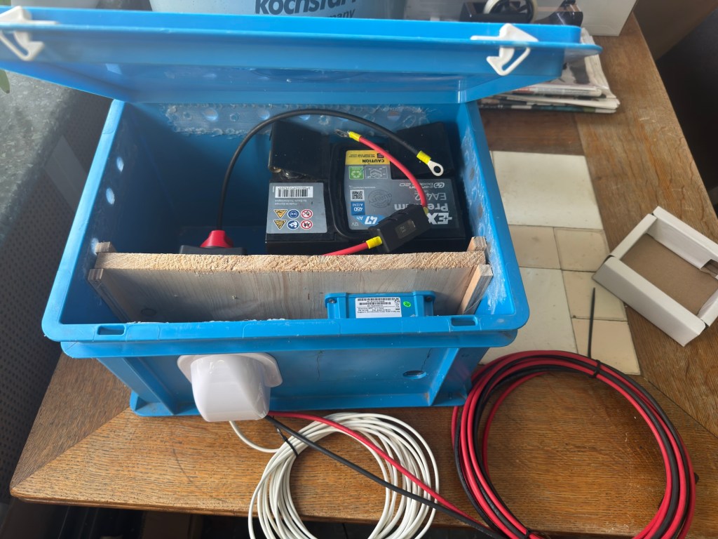 Dit systeem werkte zo goed dat ik dit jaar ook op de andere stand met elektrische harpen ga werken. De harpen zijn ondertussen al klaar en nu heb ik ook de rest klaargemaakt. De omvormer en de batterij zijn weer in een kist gemonteerd. Het zonnepaneel wordt later in het seizoen op een rek geschroefd en de kist kan daar dan onder.