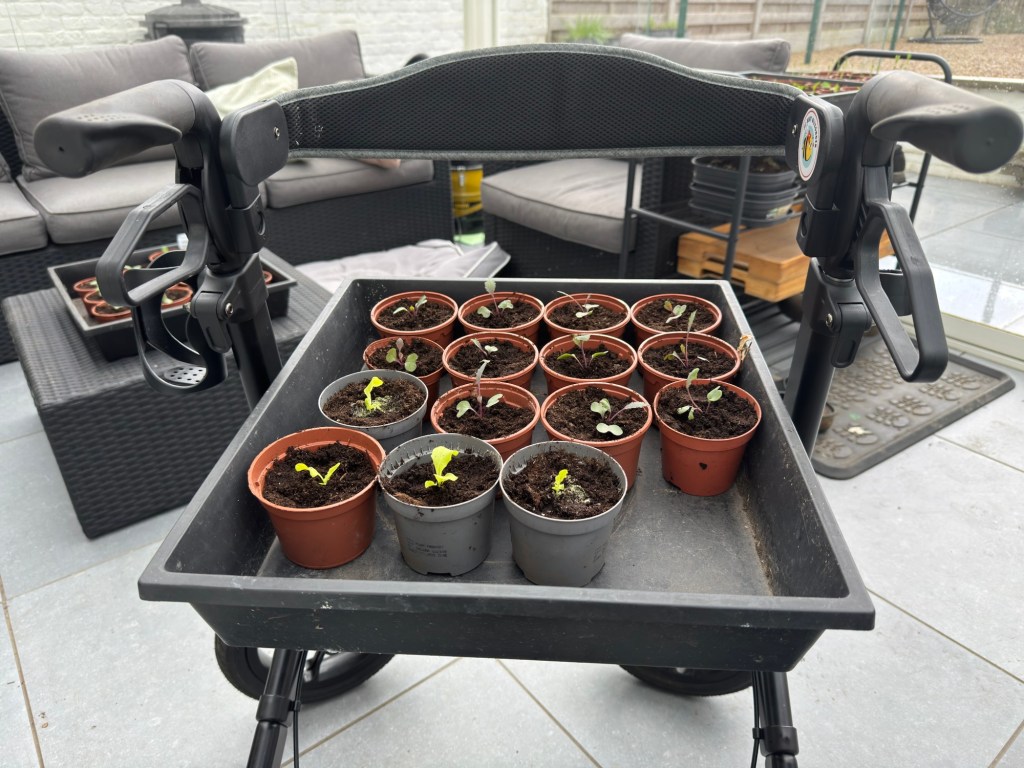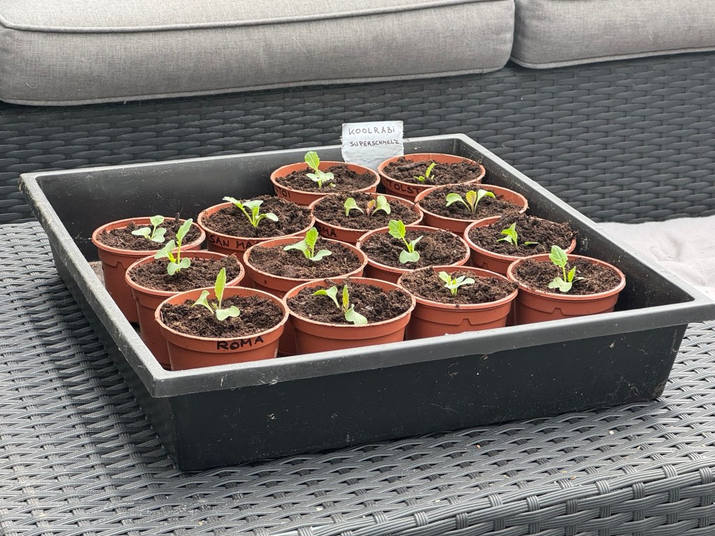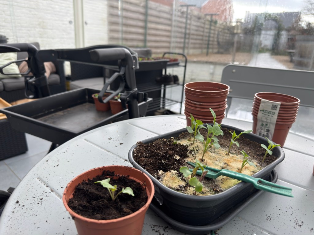 De groenten die zijn voorgezaaid op 1 maart heb ik daarstraks verspeend. De broccoli, bloemkolen, rode kolen en koolrabi.