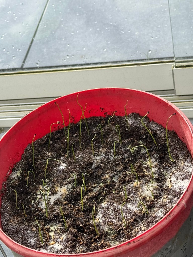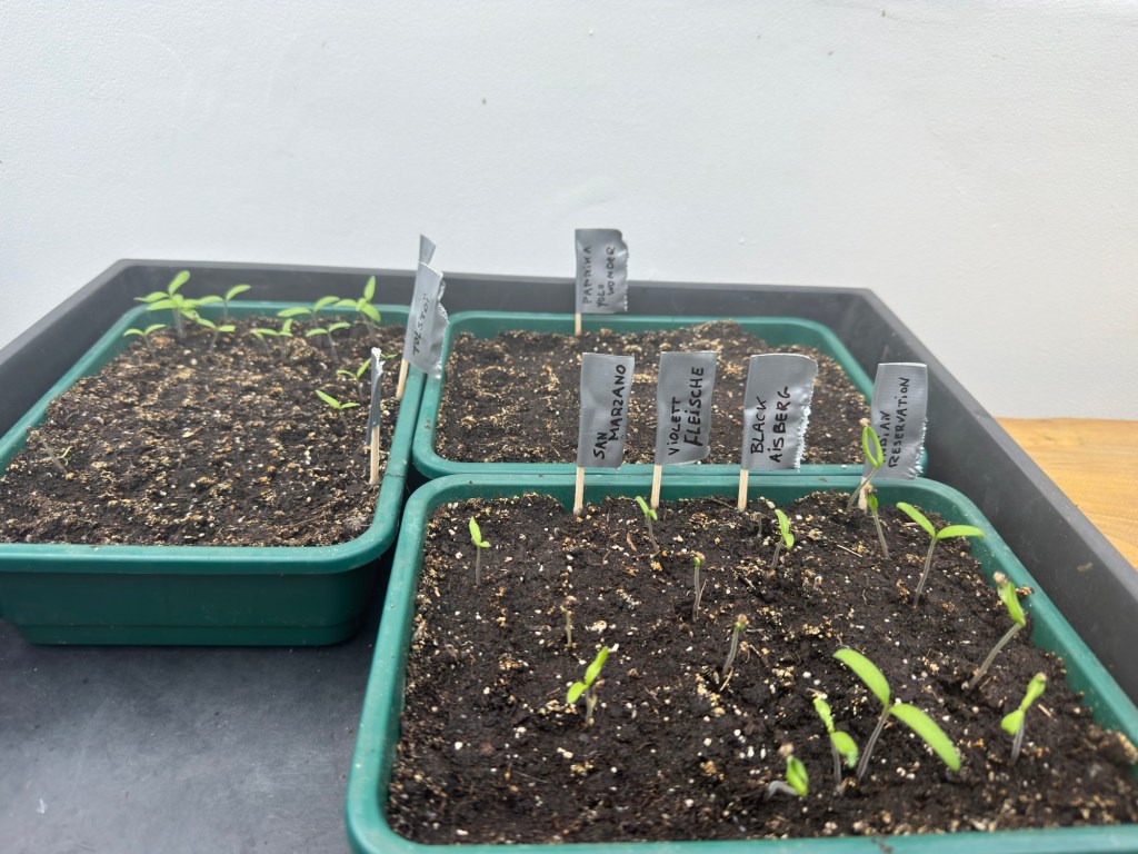 De tomaten zijn voor een groot deel al gekiemd. Om te verspenen wacht ik nog minstens een week. Normaal wordt dat gedaan als ze de eerste echte blaadjes hebben. De meeste groenten zaai ik voor in trays die ik in de veranda plaats. Maar tomaten, paprika’s en volgende week de courgette, komkommers en pompoenen blijven binnen tot eind april. Pas daarna gaan deze naar de veranda om af te harden.