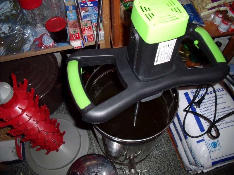 Met de electrische betonmixer (nieuw gekocht voor dit doel), kan ik makkelijk 2 x daags gedurende een 5-tal minuutjes roeren.