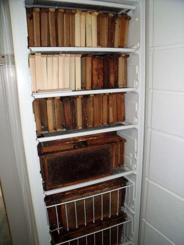 Na het leegslingeren van de honingramen, hebben de bijen zelf een dag de tijd gekregen om de ramen proper te likken. De ramen die er op die manier proper gepoetst uitzien, heb ik in een draaiende diepvriezer gezet.