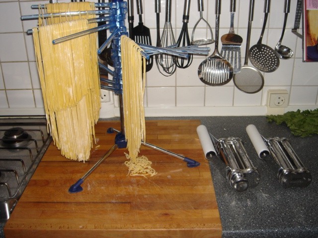 Hierna even wat spaghetti gedraait voor vanavond. In het verleden gebruikte ik een manuele spaghettimolen waardoor ik eigenlijk een hand tekort had. We hebben dan maar besloten om nog enkele hulpstukken aan te schaffen voor de Kenwood en dat is echt een openbaring. Op een half uurtje heb ik 300g mooie spaghetti klaar. Mijn vrouw gaat content zijn als ze vanavond thuiskomt. En zeker als ik nog de tijd heb voor de afwas.