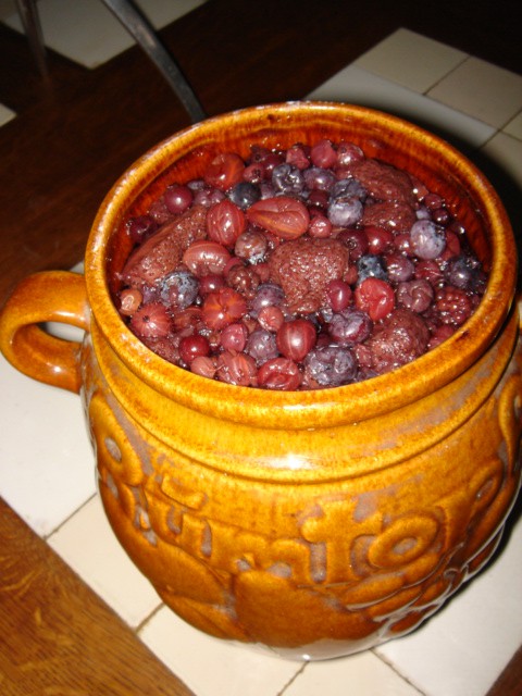 Hierna ook even de rumtopf gecontroleerd en ook die is perfect te genieten. De plasticfolie wordt gebruikt om een goede afdichting te bekomen. De vruchten drijven op de rum en ik heb het al meegemaakt dat fruitvliegjes de bovenlaag ongenietbaar maken als de pot niet goed is gesloten.