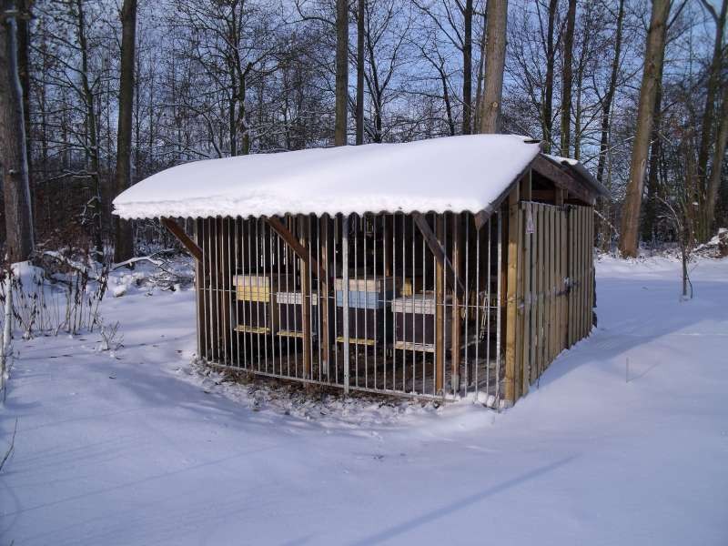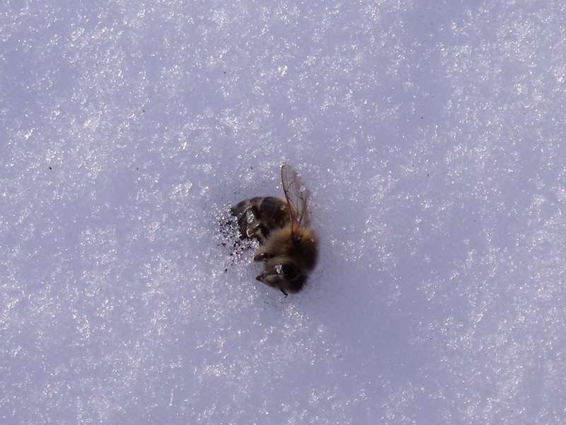 De dode bij in de sneeuw was vandaag de enige. Een week na de oxaalzuurbehandeling waren er wel een tiental per dag, maar dat schijnt dan normaal te zijn. Deze bij is even buitengekomen en vrijwel onmiddelijk dood neergevallen in de sneeuw, nauwelijks enkele meters voor de kasten. Misschien was het een oude bij die zich niet goed voelde en ging sterven, of ze werd aangetrokken door een lawaai rond de kast en kwam poolshoogte nemen. Het zou zelfs kunnen dat ze werd aangetrokken door de lichtweerkaatsing op het witte sneeuwtapijt. Het gaat in elk geval om een verwaarloosbaar aantal bijen en zolang ze buiten de kast sterven, houden ze de kast zelf hygiënisch proper. Af en toe ga ik even met een stropijltje door het vlieggat om enkel dode bijen buiten te werken. Een verstopping van het vlieggat door dode bijen dient in elk geval te worden voorkomen. Ook dit geeft weer een idee over de gezondheidstoestand van de overwinterende bijen zonder het volk zelf te zien.