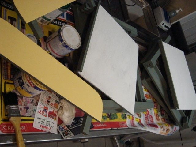 Vorige week heb ik de nieuw aangekochte bodems en deksels geverfd. Alleen de buitenkanten zijn geverfd. De varroabodem is wit geverfd om de mijten beter te kunnen zien en de vliegplankjes heb ik geel geverfd. De bijen zien deze kleur het best naar het schijnt. De kastdelen zelf zijn in een soort grijsgroen geverfd. Alle verf is op waterbasis zonder schadelijke stoffen voor plant en dier.