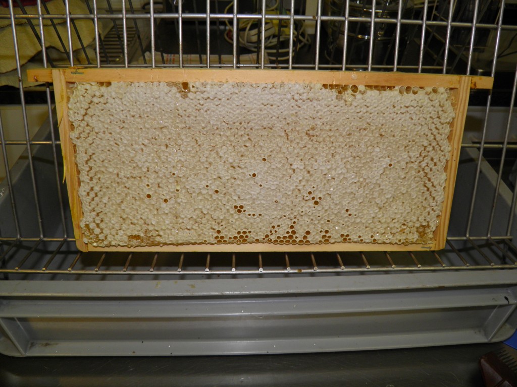 Ze brachten 19,8kg honing op de weegschaal. Dat zijn dus toch weeral 39 potten. Ik heb geprobeerd om te ontzegelen met de föhn en dat ging perfect en vliegensvlug. Enkele ramen die vorig jaar nog waren bebroed, heb ik met de ontzegelvork moeten ontzegelen. Als de honing wordt opgeslagen in onbebroede raten, worden de deksels geplaatst met een laagje lucht er onder. Dit laagje kan dan worden verhit, waardoor de dekseltjes smelten en deels wegspringen. Als de raat ooit is bebroed, leggen ze de wasekseltjes vlak op de honing en lukt het niet om ze af te smelten. De was smelt dan samen met de honing en dit is niet te slingeren. Het geeft alleen een vieze brij. De snelheid van het ontzegelen met de föhn in vergelijking met de ontzegelvork, heeft me wel doen besluiten om alle ramen met oude raat te smelten deze winter. Als ik ze volgend jaar per honingbak half om half kunstraat geef en uitgewerkte ramen, net zoals dit jaar, heb ik toch maar de helft van de uitgewerkte ramen nodig. Ik kan de andere helft dan smelten. De wasramen blijven dan ook maar 2 seizoenen in gebruik.
