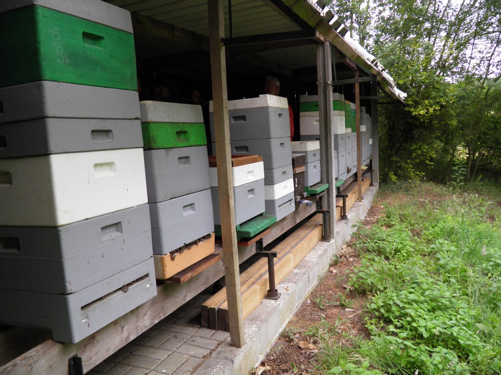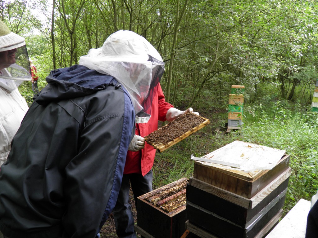 Zondagvoormiddag was er een praktijkles voorzien bij de voorzitter. Controle van enkele volken in kleine groepjes om iedereen de kans te geven een raam uit te halen. Er werd ons uitdrukkelijk gezegd om niet op zoek te gaan naar de koningin maar wel te zoeken naar eitjes. De voorzitter zelf heeft dan ter demonstratie, uit een gevangen zwerm, de koningin gezocht en gemerkt.