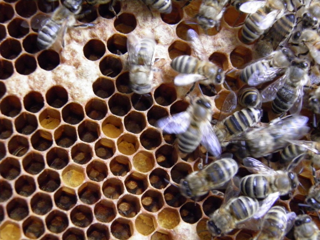 Zaterdag heb ik de afleggers een vijfde of zesde raam gegeven. Zodra het nieuwe broed begint uit te lopen, drie weken nadat de jonge koningin is beginnen te leggen, kan het volk serieus beginnen aangroeien. Dan moet ik alert zijn om ze voortdurend nieuwe wasramen te geven. De nieuwe wasramen worden dan snel uitgebouwd en dit geeft de koninging weer nieuwe plaats om te beleggen. Want ook de nectar en de pollen komen sneller binnen als er meer bijen zijn, waardoor de koningin wel eens plaatsgebrek kan krijgen.