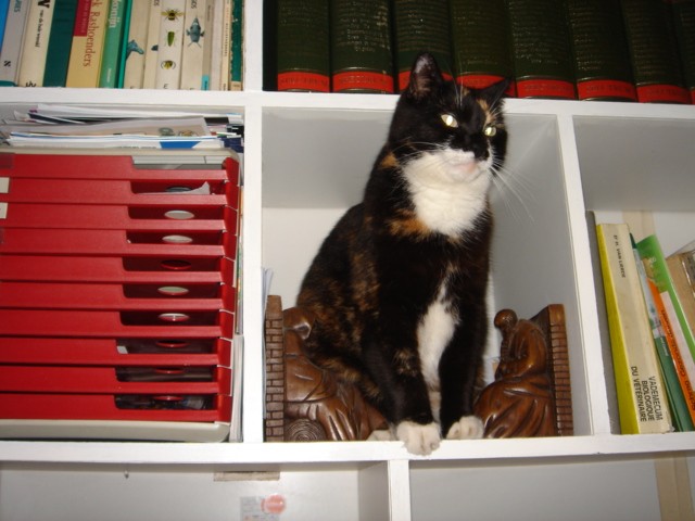 ’s Morgens komt poes Laguna altijd bij mij op het bureau. Ze wil dan even alle aandacht trekken. Vandaag heeft ze haar troon gevonden in het boekenrek achter mij. Ze bevind zich nu juist boven mijn hoofd en geeft regelmatig een tik met haar voorpoot, waarna ik haar weer moet krabben onder haar kin.