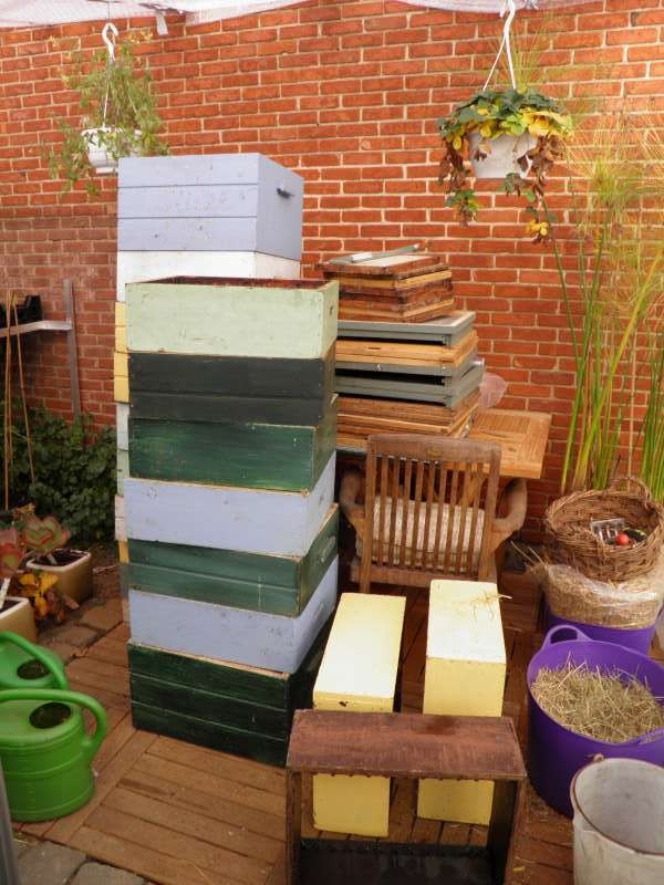 Het winterwerk aan de kasten is gebeurd. De lege broed- en honingkamers zijn langs binnen uitgebrand en de buitenkanten zijn terug voorzien van een laagje verf.