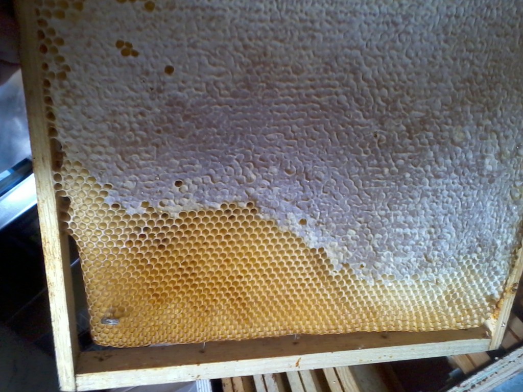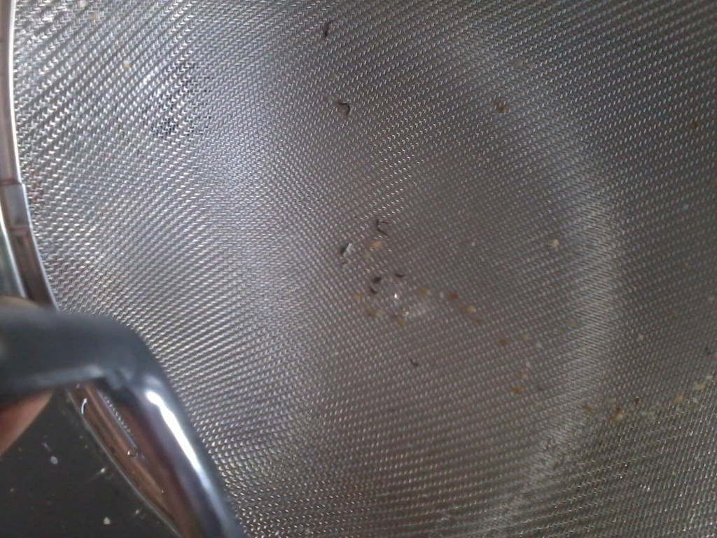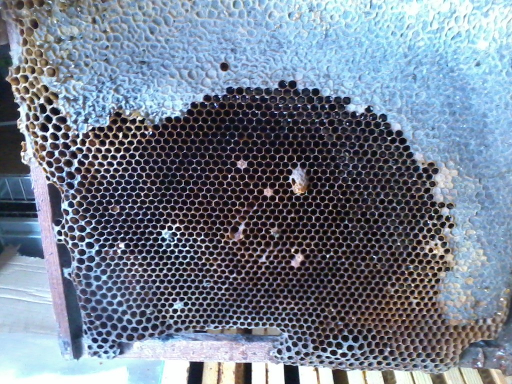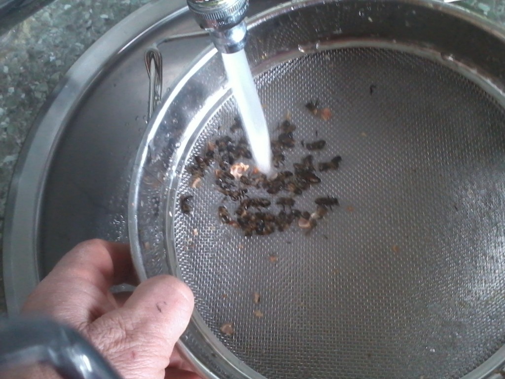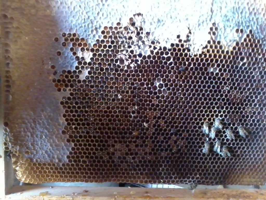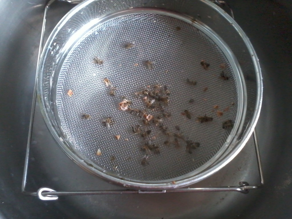 Vandaag heb ik de kast weggehaald uit de stal. Uit schrik dat bij de hogere temperaturen volgende week de ramen zouden beschimmelen. De oude ramen die afkomstig waren van de broedaflegger worden vernietigd. De andere ramen kan ik wel terug gebruiken. Ik zal de ramen met voer invriezen en bewaren voor de nieuwe afleggers later dit jaar. Op de bodem lagen 147 bijen en op de ramen vond ik er 49. Ik heb de 49 bijen van de ramen in een honingzeef gespoeld. De eventueel aanwezige varroamijten blijven dan achter op de onderste fijnste zeef. Hier telde ik 1 jonge varroamijt. Volgens een artikel van Pia Aumeier dienen we pas ongerust te zijn vanaf 1 mijt per 10 bijen. Ik kan me natuurlijk afvragen of de verdwenen bijen niet alle mijten hebben meegenomen op hun laatste vlucht. En misschien verlaten de mijten wel een afstervende kast zoals de ratten een zinkend schip schijnen te verlaten? Enfin, de reden voor het afsterven lijkt toch duidelijk te zijn op de foto met de koninginnendop. Dit volk heeft blijkbaar op een redcel een nieuwe koningin geproduceerd toen er geen darren meer waren. Ik heb ze niet gevonden en wellicht heeft haar instinct haar wel op een fatale, want vruchteloze, bruidsvlucht gestuurd. Volgens mij betreft het hier dus geen verdwijnziekte en ook geen teveel aan varroamijten. Er was nog zoveel voer aanwezig dat het ook geen hongervolk betrof. Laten we dit maar snel vergeten.