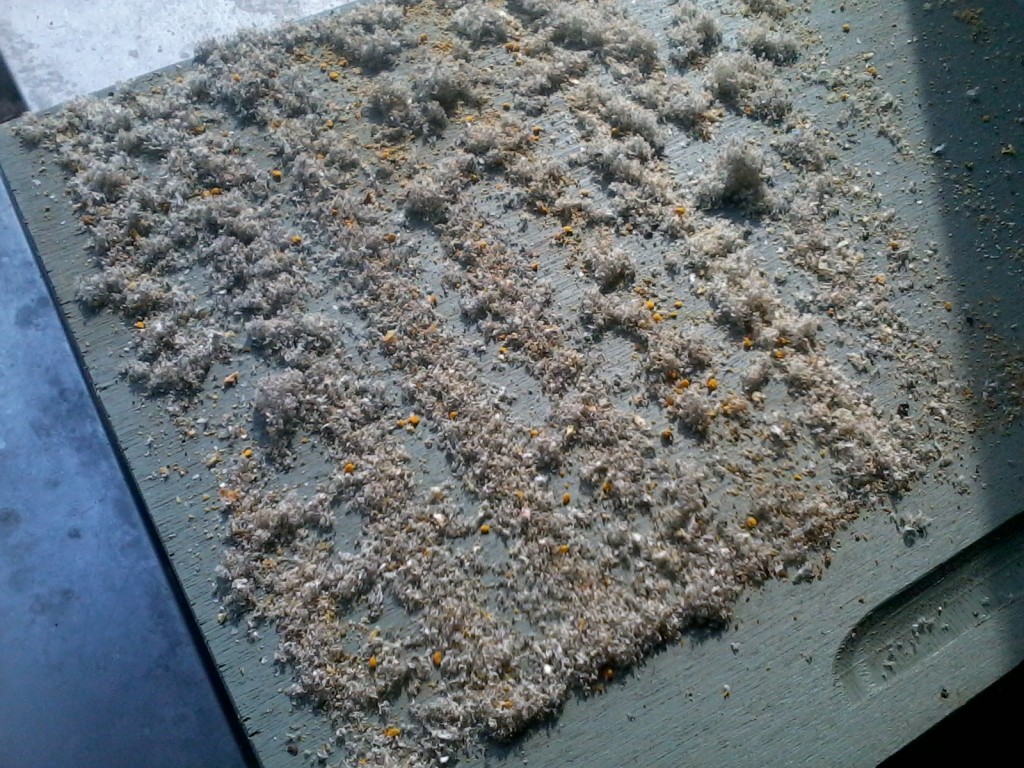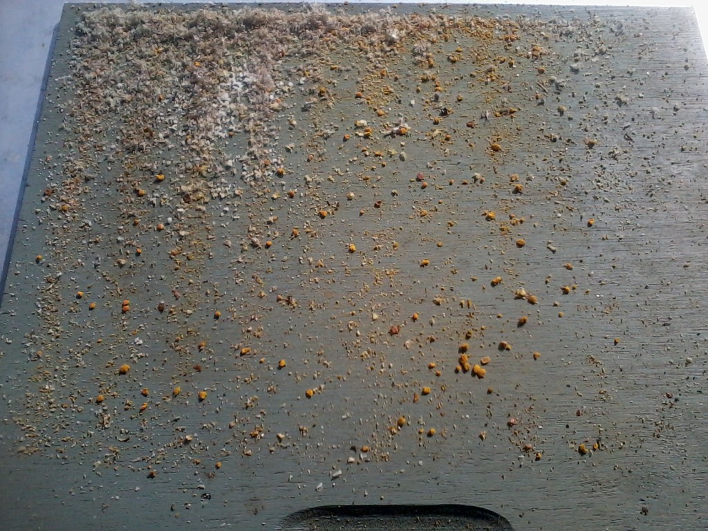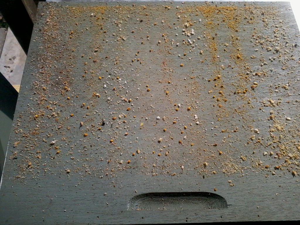 Deze namiddag vlogen de bijen enorm. Het was dringen aan het vlieggat en de meesten hadden twee enorm gele proppen stuifmeel bij. Enkele bijen hadden blijkbaar zelfs een stuifmeelbad genomen. Ze waren letterlijk helemaal geel. Bij controle van de schuiven was bij kast 1 en kast 4 goed te zien dat ze de krant al deels of geheel verwijderd hebben. Ze zijn dus al naar boven aan het sleuren. Hopelijk heben we dit jaar weer wat wilgenhoning zoals vorig jaar. Op de 2de foto is goed te zien dat ze op alle straten werken. Ze laten zich dus blijkbaar toch niet storen door het vulblok. Naar mijn bescheiden mening ziet het er goed uit.