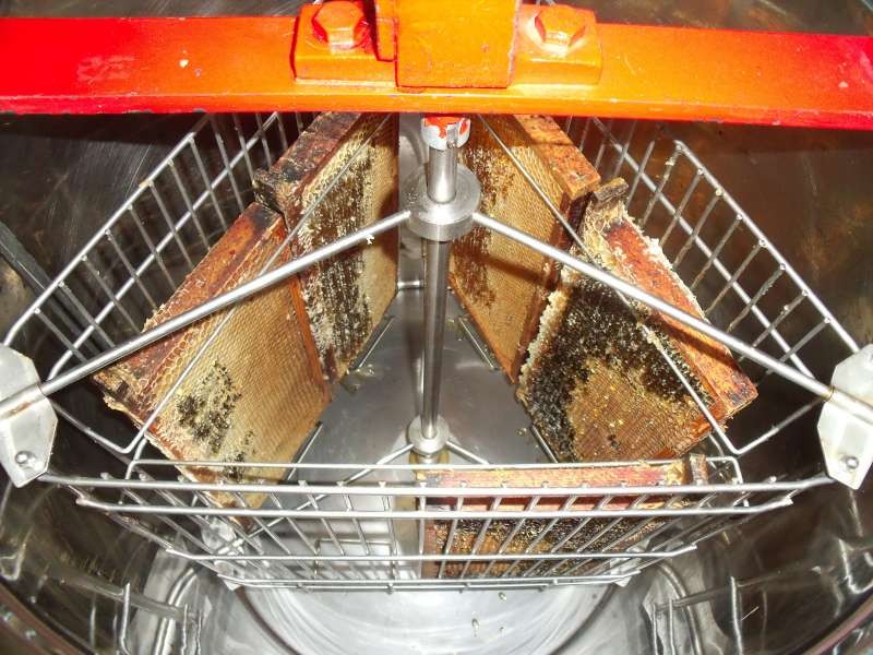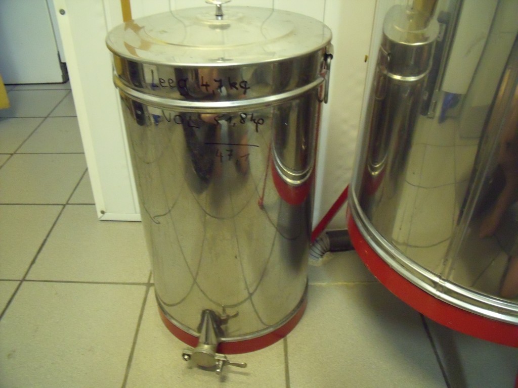 Ze waren echter gemakkelijk met een vochtige, koude doek weg te nemen. Na het ontzegelen gaan ze met zes tegelijk in de slinger. Eerst voorzichtig de eerste kant half leegslingeren en daarna de andere kant volledig leegslingeren en dan nog een latste maal draaien om de eerste kant volledig leeg te slingeren. Indien de eerste kant direkt helemaal wordt leeggeslingerd, kan het gewicht van de andere kant zo groot zijn, dat de raat uit het raam breekt. De honing wordt door een dubbele zeef dan in een emmer gegoten waarna de honing in rijpervaten wordt weggezet op een warme plaats. Nu kunnen de laatste wasdeeltjes en luchtbellen opstijgen, die dan na 2 dagen worden afgeschuimd. Pas daarna gaan de rijpervaten naar de kelder om te worden geroerd tot de kristallisatie voldoende is om de honing opte potten. Het roeren samen met de keldertemperatuur zorgt voor de vorming van kleine kristallen. En hoe kleiner de kristallen zijn, hoe smeuiiger de honing wordt. Vandaag is op deze manier 78kg in de rijpers gedaan. De leeggeslingerde ramen heb ik hierna op het sterkste volk gezet om te laten leeglikken. Het sterkste volk laat zich niet beroven en gaat ook niet zelf op rooftocht als ze deze buitenkans krijgen.