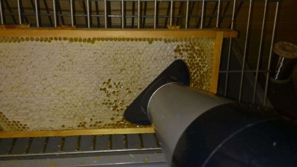 De morgenstond heeft goud in de mond. Of honing. Vanmorgen begonnen met het slingeren van de honing. Het ontzegelen doe ik tegenwoordig met de föhn. Dit gaat beduidend sneller dan met de ontzegelvork en er is ook geen ontzegelwas te zuiveren. Wel hangt alles vol met weggesprongen wasdekseltjes. Dus niet aan te raden in uw keuken.