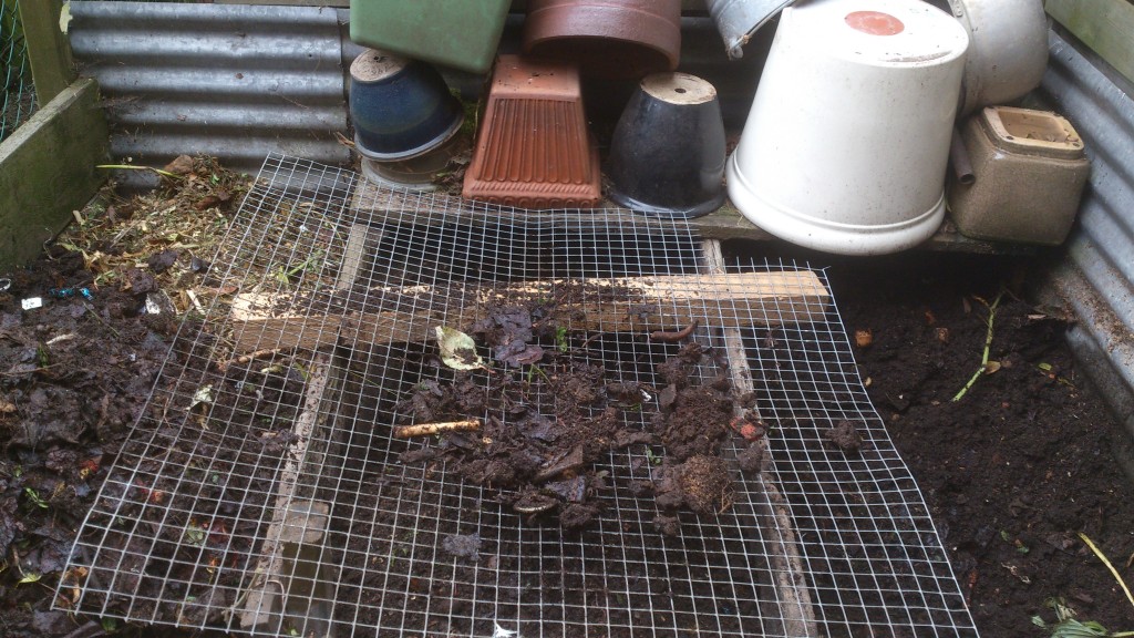 De zomer loopt op zijn eind en ik heb de compostbakken nog eens door elkaar gehaald. De middelste bak zit nu vol gezeefd compost dat klaar is om te worden gebruikt. De buitenste bakken schep ik een drietal keer per jaar van de ene in de andere om lucht in de massa te brengen.