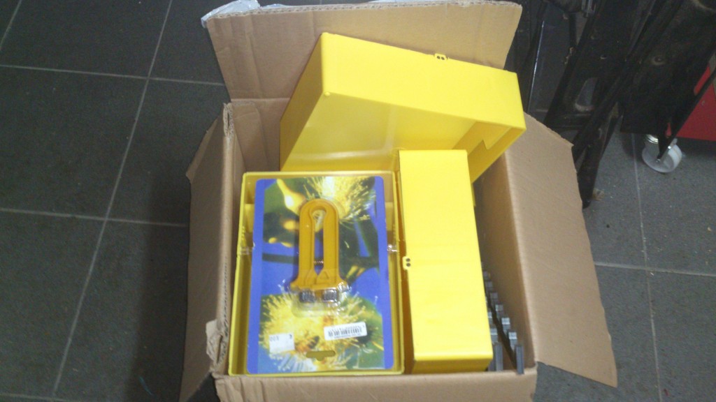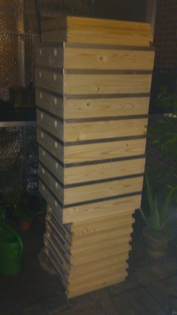 Het knutselmateriaal voor de volgende maanden is toegekomen: enkele platen watervast multiplex van 18mm om broedbakken en honingbakken te maken. Een vijftal broedbakken en 8 honingbakken heb ik gepland. De varroabodems en de daken met zinken deksel heb ik vandaag ook afgehaald. Deze kan ik voor hun prijs wel zelf maken, maar daar gaat teveel tijd in verloren. De kasten zelf zijn eigenlijk op een dag klaar. De bleddens, de vlieggatschuiven en zelfs de voederbakken, heb ik ook alvast meegebracht. Eerste werk is nu het verven van de deksels en bodems om ze daarna in de bijenhal te stockeren tot volgend jaar. Een nieuwe kast kost me zo slechts 90 euro in plaats van de 147 euro voor een complete kast bij het Bijenhof.