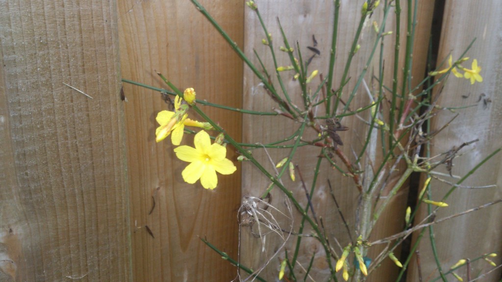 De winterjasmijn heeft al enkele bloempjes. De moederplant waar deze stek van afkomstig was, bedekte een ganse muur met gele bloempjes rond dit moment. Hopelijk komt het met dit plantje ook nog ooit zover. Ook de Viburnum tinus geeft slechts enkele bloempjes, maar de struik staat ook nog maar sinds vorig jaar. De grote boswilg op de derde foto daarentegen is al enkele decennia oud en bedekt zich binnen enkele weken volledig onder een tapijt van geelwitte wilgenkatjes. Nu het populierenbos is gekapt, zullen mijn bijen de boom vermoedelijk veel vroeger vinden. De enige bomen die ze nu moeten overvliegen zijn de pas geplante knotwilgen en het windscherm van wilgentenen.