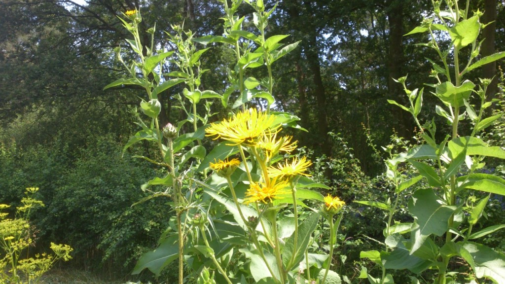 Vorig jaar heb ik deze plant gekocht in een potje. Ik wist weliswaar dat de Griekse Alant een hoge plant werd, maar nu in het tweede jaar wordt hij echt imposant. Ruim 2 meter hoog en met meerdere bloemknoppen. De eerste bloemen staan nu open.