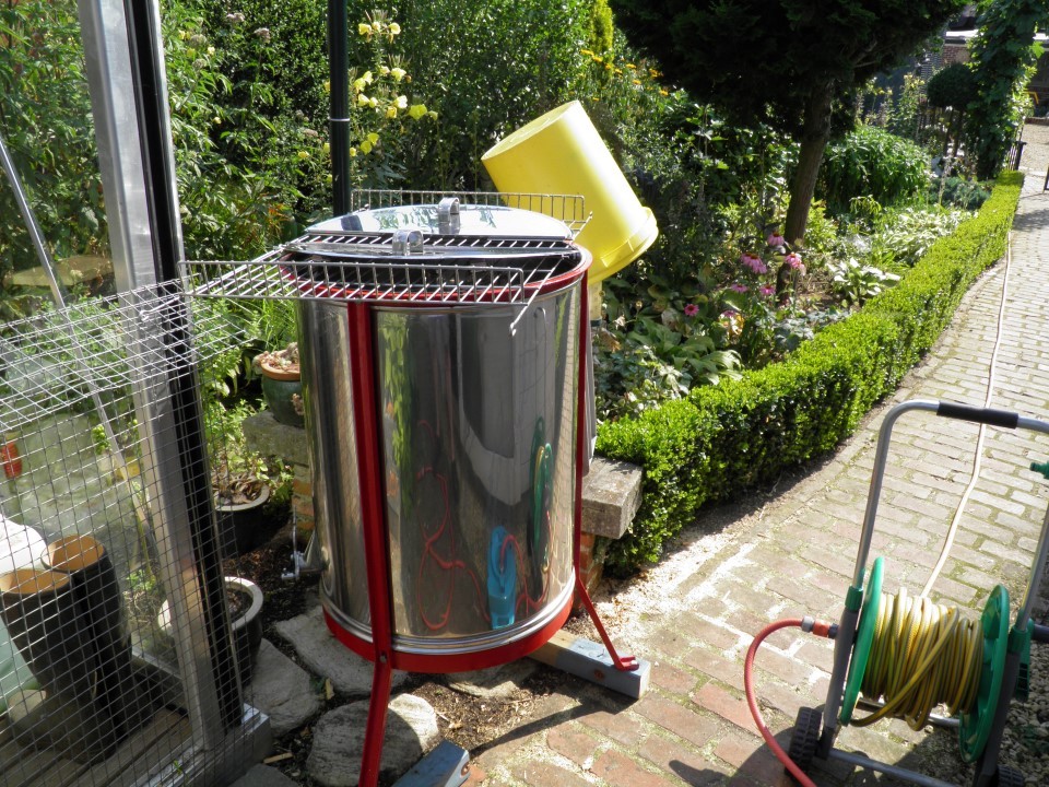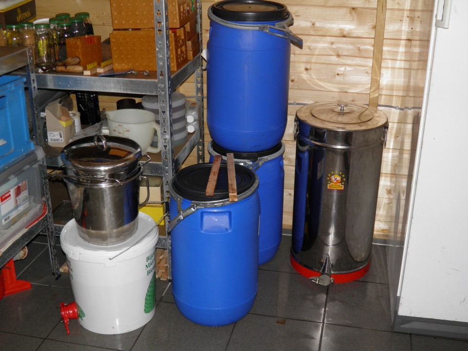 Met twee torens honingzolders in het slingerlokaal is de ruimte vrij beperkt. Na het slingeren wordt het materiaal buiten afgewassen en kan het drogen in de zon. Het resultaat kan nu beginnen klaren in de rijpingsvaten.