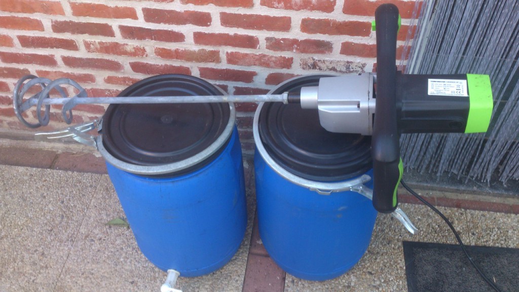 Vermits ik vrij veel jonge volkjes heb opgezet en de ganse maand augustus slechts heb geprikkeld om een groot wintervolk te maken, is de voorraad apigold veel te klein om alle volken in te winteren. Ik heb daarom maar besloten om ze in te winteren met zelfgemaakte suikeroplossing. Een tonnetje wordt gevuld met 15 kg suiker en 10 liter warm water. Slechts 5 minuutjes roeren met de betonmixer en een nieuwe portie is klaar. Het enige probleem is dat ik meer suiker verbruik dan de lokale Okay kan leveren. Ik heb er dan maar apart bijbesteld. Mocht dit te lang op zich laten wachten kan ik altijd nog naar een lokale groothandel voor horecabenodigdheden. Daar kan ik suiker kopen in zakken van 25kg. Als ik elke dag 2 liter geef zijn ze binnen 10 dagen met 20 liter bijgevuld en kunnen ze ertegen tot het voorjaar. Ik probeer om niet te gierig te zijn met invoeren. De prijs van dit beetje suiker is toch niet te vergelijken met de honing die ze leveren. Een productievolk levert toch vlot 30 kg honing en krijgt daar dan later 15 kg suiker voor in de plaats. In het jaar ervoor hebben ze als jongvolk ook 15 kg suiker gehad en eigenlijk ruilen ze dus een kg suiker voor een kg honing. Dan kunnen wij toch niet gierig handelen.