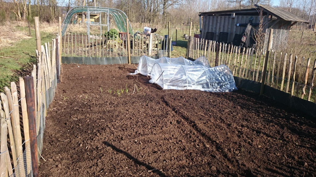 De moestuin droogt snel op en de eerste bedjes zijn klaargemaakt. Look en sjalotten heb ik al geplant. De folies zijn klaar om uien en peulen onder te zetten. Centraal staat nog een bedje met overwinterde look.