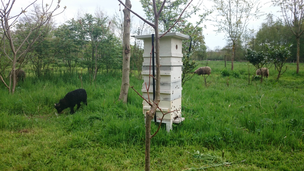 Deze voormiddag ben ik naar Brustem geweest voor de twee bestuivingsvolken. Ze hadden beide een volledig darrenraam verzegeld en dat heb ik dus uitgesneden. Eén volk had ook nog wat darrenbroed op de ramen en ook dat heb ik met de vork vernietigd. De volgende week zal de kers daar zeer goed geven als het af en toe wat regent. Tot nu toe was het te droog voor de bloesems. Het eerste volk had al wat honing in de honingzolder gebracht, terwijl het tweede daar nog niet aan toe was. Maar het zijn twee mooie grote volken en ze waren ondanks de opkomende bewolking zeer zachtaardig. Maar desondanks kreeg de kersenboer, die toevallig langskwam toch een bezoekster onder zijn hoedje en dat heeft hij geweten. Misschien droeg hij niet de juiste aftershave?