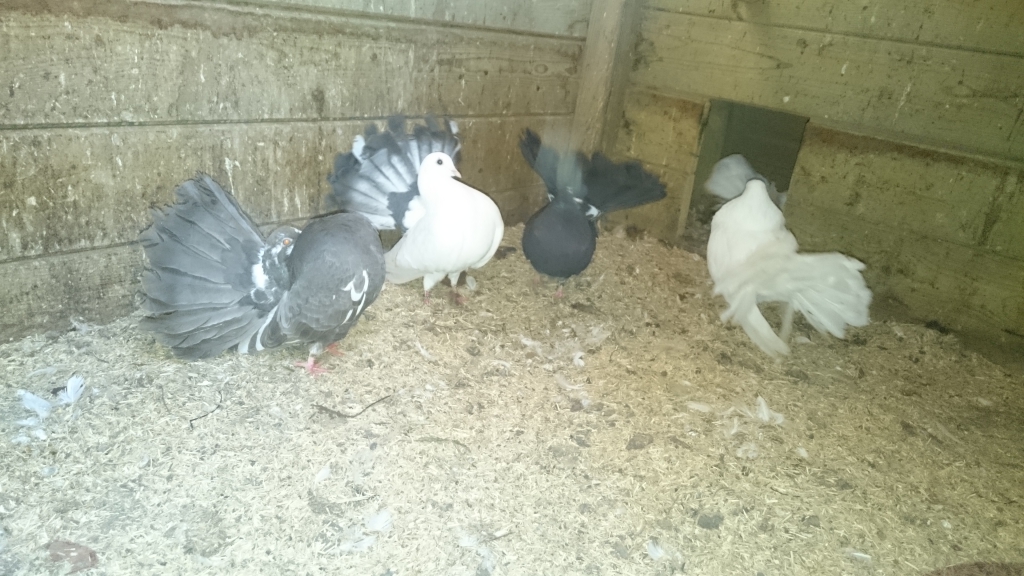 Ook de pauwstaartduiven hebben al twee jaar niet meer gekweekt. Vanwege het eetpatroon van de lokale steenmarter en sperwer, was het bestand iets uitgedund. En toevallig waren alle duivinnen op hun bord beland. Vandaag ben ik echter al vroeg naar de dierenmarkt te Mol geweest en heb me er drie jonge pauwstaartjes aangeschaft. De oude duivers waren in elk geval heel opgetogen.