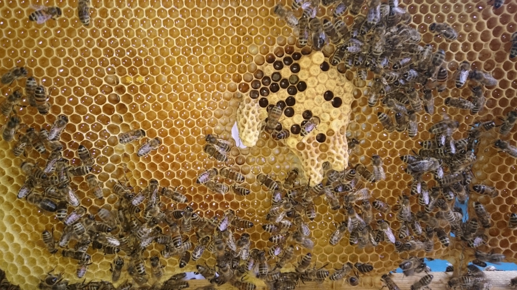 Ik had het rondje in een slecht uitgebouwd raam gestoken. Dit raam kan nu na deze operatie gans worden vervangen. Aan beide zijden in totaal 5 doppen, allen even oud. Er was gisteren op dag 12 nog geen uitgelopen. In het donorvolk vond ik toen echter zo weinig eitjes en jonge larven dat ik niet kon kiezen waar ik mijn rondje uit stak. Als dit nu alleen maar eitjes waren van 1 dag oud, lopen de doppen zelfs pas uit op dag 15. Ik wacht voorlopig op de tuter en open dan de andere doppen.