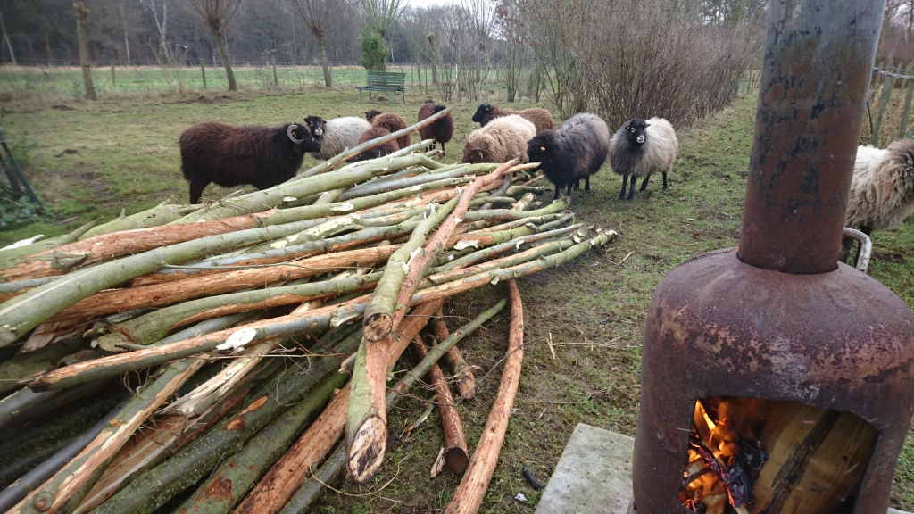 De schapen zijn ondertussen zeer behendig geworden in het ontschorsen van de takken. De dikste takken op de foto moeten nog worden verzaagd tot stookhout. De kleine takjes gebruik ik dit jaar om langs de perceelsgrenzen een takkenwal op te bouwen.