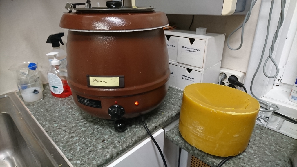 Gisteren, tijdens de voorbereidingen van het kerstfeest, heb ik mijn bain-marie nog eens opgezet. Niet om waswafels te gaan gieten maar om de was zelf te zuiveren. Zonder veel moeite doet deze soepketel al het werk zelf.