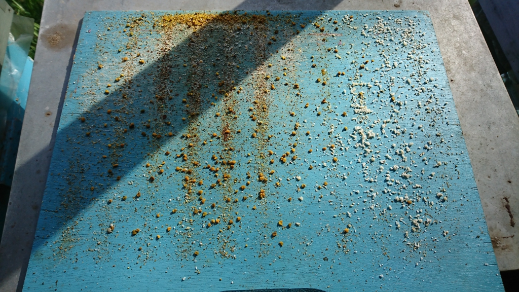 Vandaag voelde ik me beter en het moest dan maar gebeuren. Gelukkig dat alle kasten onder dak staan. Wat een miezerige regendag. Een stalletje heeft dus toch een voordeel. Met een pufje rook langs het vlieggat moest het lukken. En of het lukte. Slechts een enkele bij vloog op en constant kwamen er zelfs bijen thuis met een nieuw vrachtje. En er zat nog geen broed in de onderste honingbakken. Ik was dus nog op tijd. Alle honingramen waren zeer zuiver, maar de middelste zaten steevast vol bijen. Een serieuze hoeveelheid nog natte nectar werd daar afgegeven alvorens de huisbijen deze verder naar de bovenste broedbak transporteerden. Ik heb deze honingbak dan even opzijgezet en de broedbak (stond al opzij) toch even geopend. Alle volken hadden een vrij groot broednest met plat verzegeld broed (werksterbroed) maar de bakken waren loodzwaar met verzegelde honing rondom. Het broednest had echt geen plaats meer om uit te breiden en ook voor stuifmeel hadden ze blijkbaar een ruimtegebrek. Daarom vermoedelijk de ganse proppen stuifmeel op de bodem.