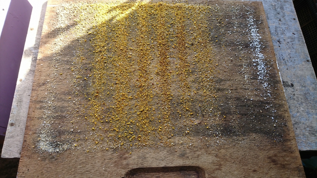 Zeer grote brokken stuifmeel die de bijen laten vallen. Ook op deze stand is er dus overdaad. Ik moest zo snel mogelijk iets ondernemen. Alle volken hadden nog een honingzolder op de bodem staan en die wou ik er zo snel mogelijk af. Om hem dan begin april terug te kunnen plaatsen boven de broedbak met een koninginnenrooster. De helft van de uitgewerkte honingramen zou ik dan vervangen door waswafels.