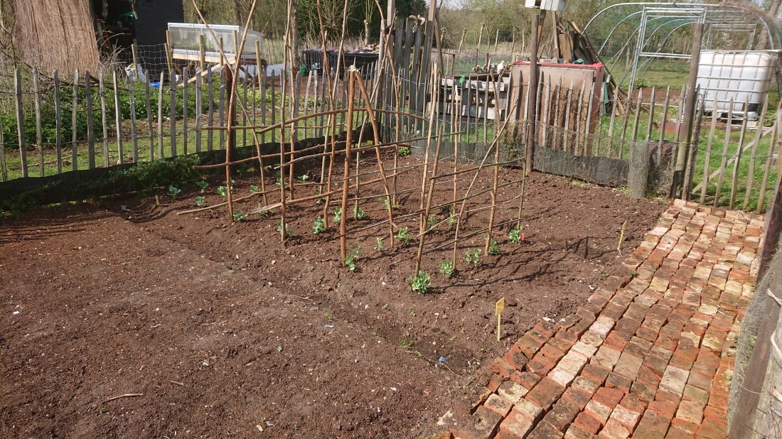 De peulen en de tuinbonen zijn verhuisd naar de moestuin. Ze stonden in 9 cm potjes en waren groot genoeg om te weerstaan aan de elementen van de buitentuin. Op de vrijgekomen plaats in de serre heb ik nu potjes kunnen zetten met verspeende koolrabi, spruitjes, kropsla en ijsbergsla. Deze kunnen dan binnen een tweetal weken ook naar buiten.
