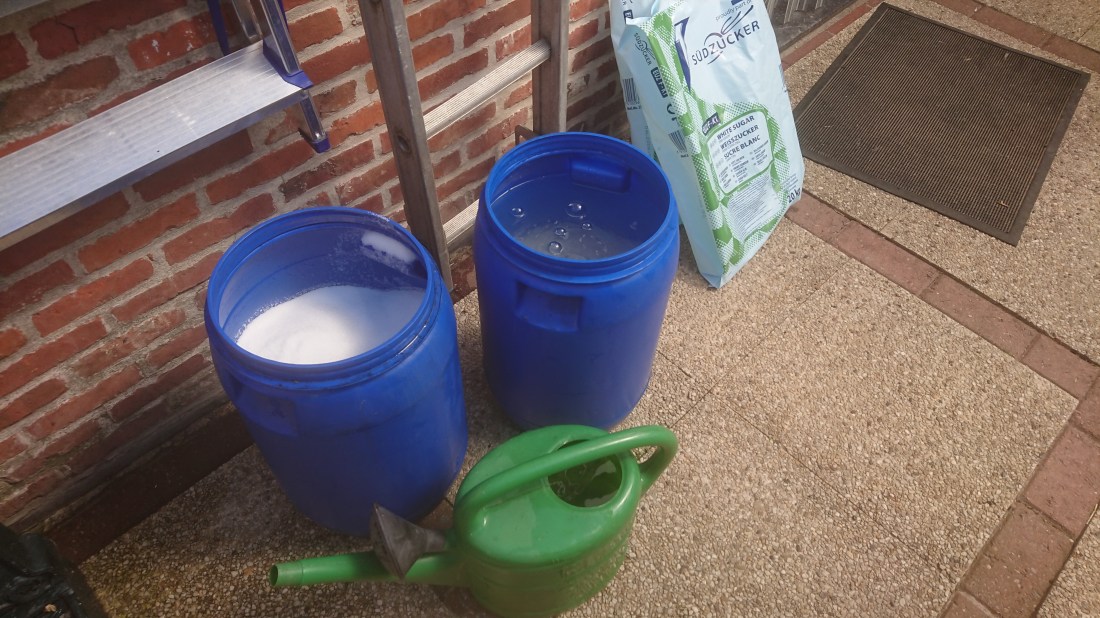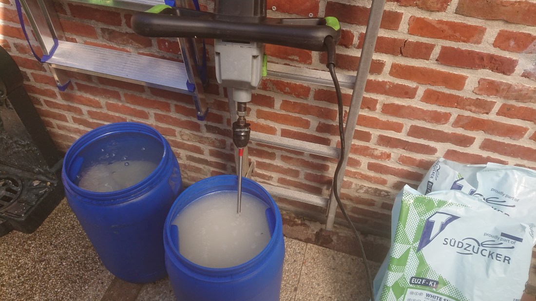 Dit jaar maak ik mijn suikersiroop weer zelf. Een zak van 20kg suiker en daarbij 14 liter leidingwater. Een verhouding van 3 op 2 dus. Dit past juist in mijn tonnetjes van 30 liter. Tweemaal daags roeren met de honingroerder en na drie keer is alle suiker prima opgelost. Kan niet simpeler.