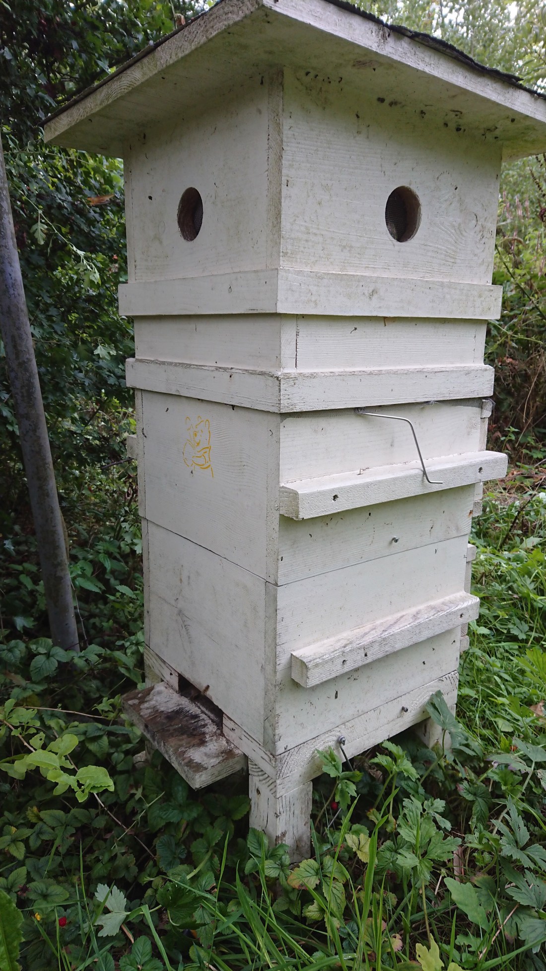 Naast de Kempische kasten heb ik dit jaar ook nog een ecokast in gebruik genomen. Ik beschouw een ecokast niet als een productiekast. Ik heb het geprobeerd gedurende enkele jaren maar het werkte niet voor mij. Wellicht prima voor de bijen, om ze op een natuurlijker manier te houden, maar bijen houden is iets anders dan imkeren. Ik heb daarom mijn ecokasten verkocht maar behield er een als zwermvanger. Dit jaar is er geen zwerm in getrokken, maar ik heb er eentje in geplaatst. Op een bepaald moment belde een klant dat hij een bijenzwerm had aan zijn huis. Ik heb deze opgehaald en in de ecokast gezet. Niet dat ik geen Kempische kasten meer had, maar ik heb geen idee vanwaar die zwerm kwam en heb geen behoefte aan inbreng van vreemde ziekten. In de ecokast mag de zwerm trachten te overwinteren en indien ze hier in slaagt, krijgen ze volgend jaar wel een Kempische kast. Dan hebben ze zich voor mij voldoende bewezen.