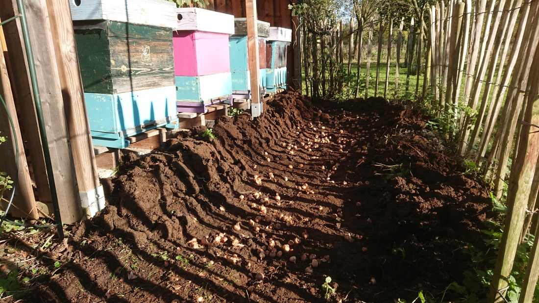 Vandaag 300 crocussen geplant voor de bijenstand. Eerst heb ik de grond een vijftal cm weggehaald en daarna de bolletjes uitgestrooid. De aarde heb ik er dan weer over geharkt en ik was klaar voor de bijen iets door hadden. Ze vlogen vanmiddag zeer goed. Het was dan ook een fraai zonnetje dat de eerste vrieskou verjaagd heeft.