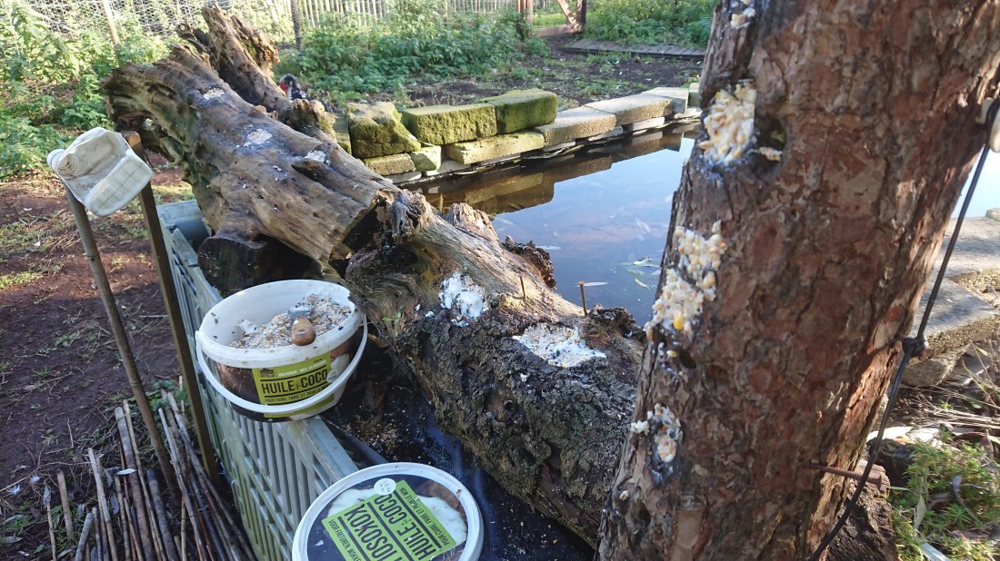 Ook aan de imkerijtuin voeder ik de vogels tijdens de winter. Om dan ook nog wat foto’s te kunnen maken, is er een waterpartij voorzien en enkele boomstammen. De boomstammen bevatten meerdere gaten die ik dagelijks opvul met allerlei zaadjes in cocosvet. Als de vogels komen eten op de stammen lijkt het op een foto veel natuurlijker.
