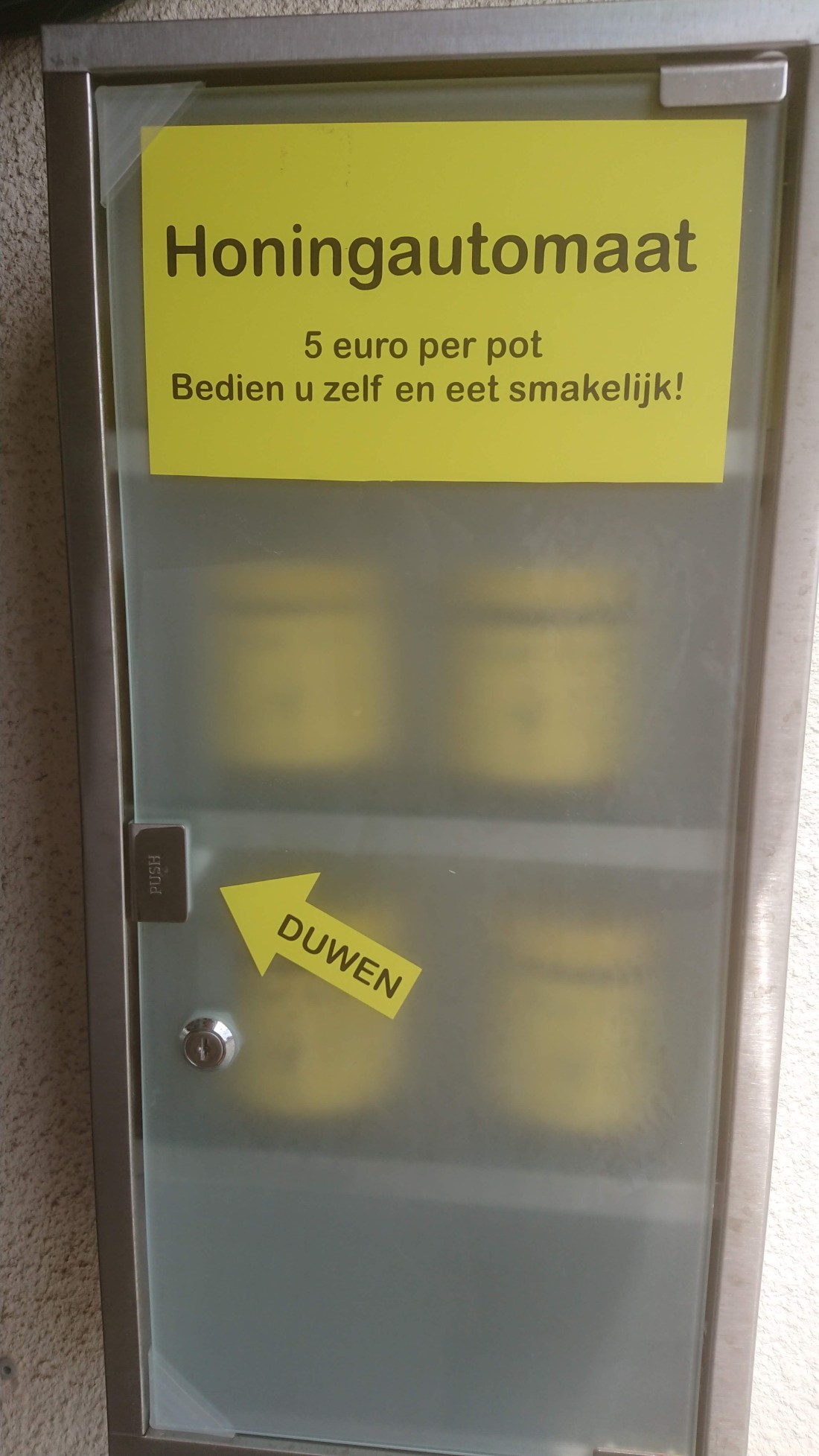 De etiketten, mijn eigen ontwerp, print ik af met een laserprinter en ze worden met melk op de pot gekleefd. Deze etiketten laten dan ook makkelijk los bij het afwassen van de lege potten. De gevulde potten, een dertigtal per keer, bewaar ik bij 13 graden, en aan de deur kan men zichzelf bedienen als ik niet thuis ben.