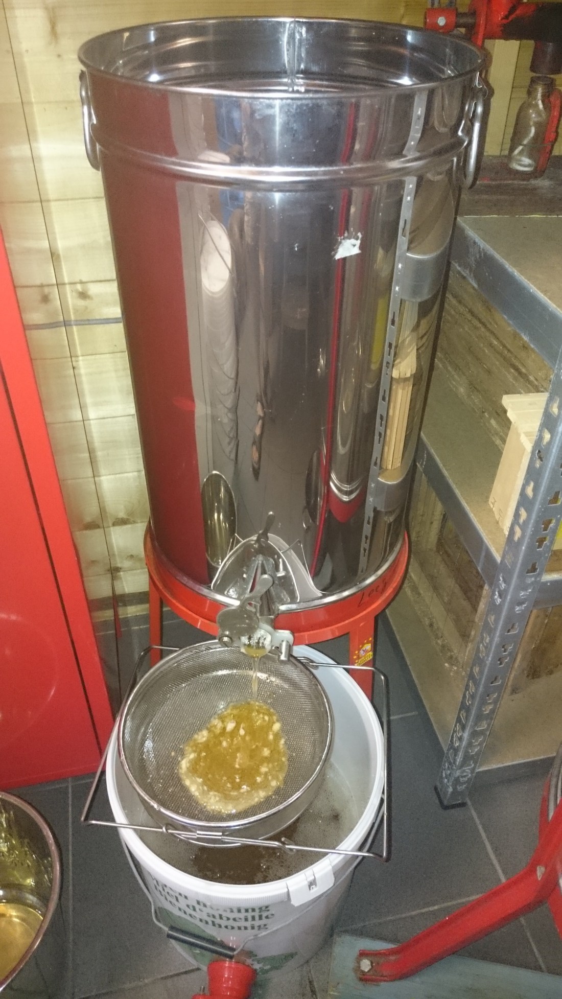 De emmers worden dan in de kelder geplaatst tot de honing wordt ingepot. Hiervoor wordt de honing terug vloeibaar gemaakt in een bain-marie op 37 graden. Na 36 uur kan ik dan de honing uit de zakken gieten in een afvulemmer. Nog eens afschuimen na 12 uur en oproeren gedurende 10 minuten. Hierna vul ik de honingpotten met deze pure honing.