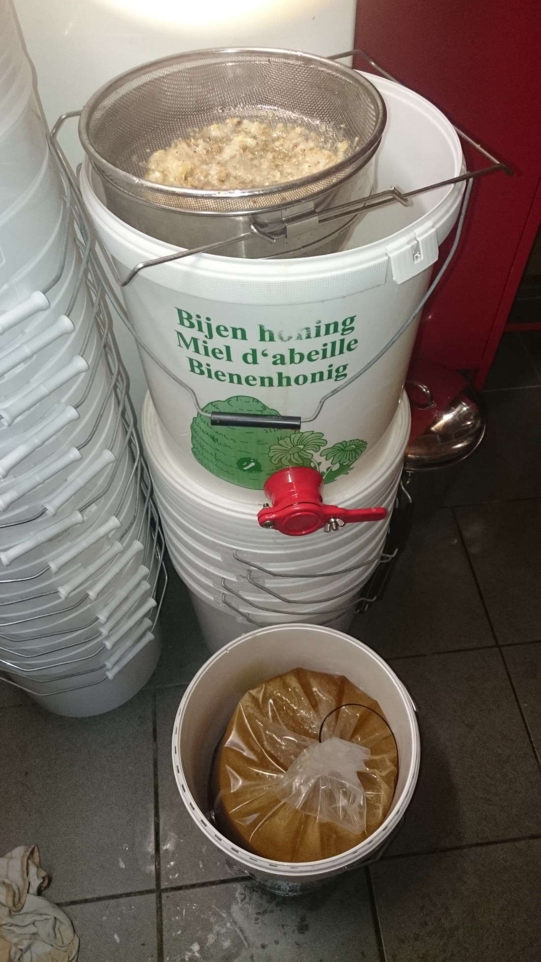 The honey then remains in the barrels for two days to “clear”. The smallest impurities and air bubbles of the extracting proces rise and can then be skimmed off. After this I fill the honey in special food-safe bags and put them in a sealed plastic bucket. Again food-safe plastic.