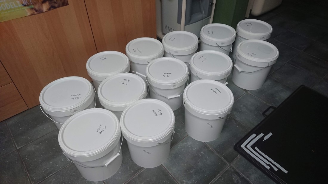 In de vaten blijft de honing dan nog twee dagen staan om te “klaren”. De kleinste onzuiverheden en de luchtbelletjes van het slingeren stijgen op en kunnen dan worden afgeschuimd. Hierna vul ik de honing in speciale voedselveilige zakken en zet ze in een afgesloten plastic emmer. Ook weer voedselveilige emmers.