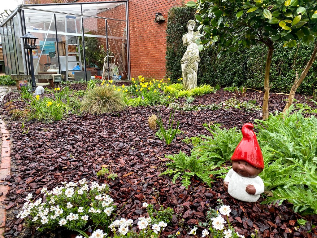 Tussen de planten in de tuin is nu een nieuwe laag schors verdeeld. De dode plantendelen zijn ook allemaal verwijderd. Het lentegevoel mag komen.