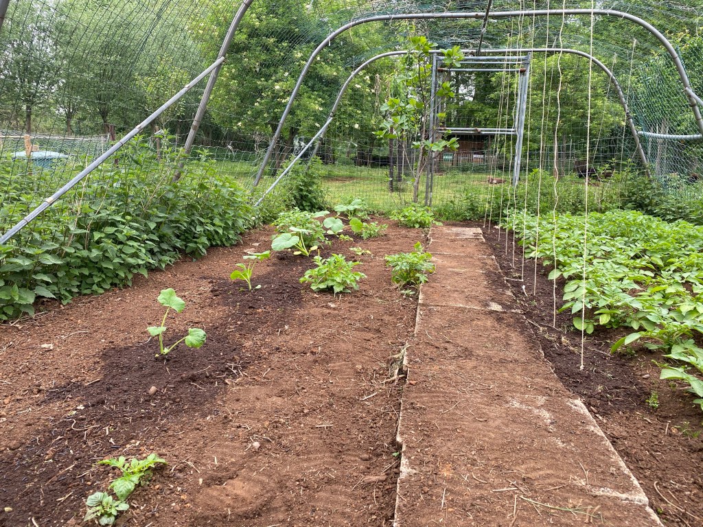 Pompoenen geplant en de bonen ingelegd. De aardappelplanten staan al mooi.In de Warrekast is een vreemde zwerm gearriveerd.De oude raten zijn opnieuw in gebruik genomen.