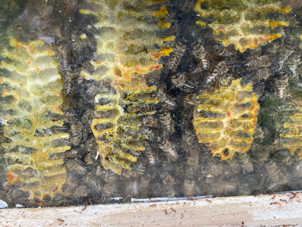 Vorig jaar had ik een zwerm in de kast gezet. Ik had de zwerm behandeld met oxaalzuur en in december nogmaals. Maar in januari verdween de laatste bij uit de kast. In de maand maart was er veel verkeer aan de kast. De laatste voorraad werd blijkbaar geroofd. En twee weken geleden zag ik geregeld speurbijen aan de kast. Nu is er dus een nieuwe zwerm ingetrokken. Geen idee vanwaar hij is gekomen.