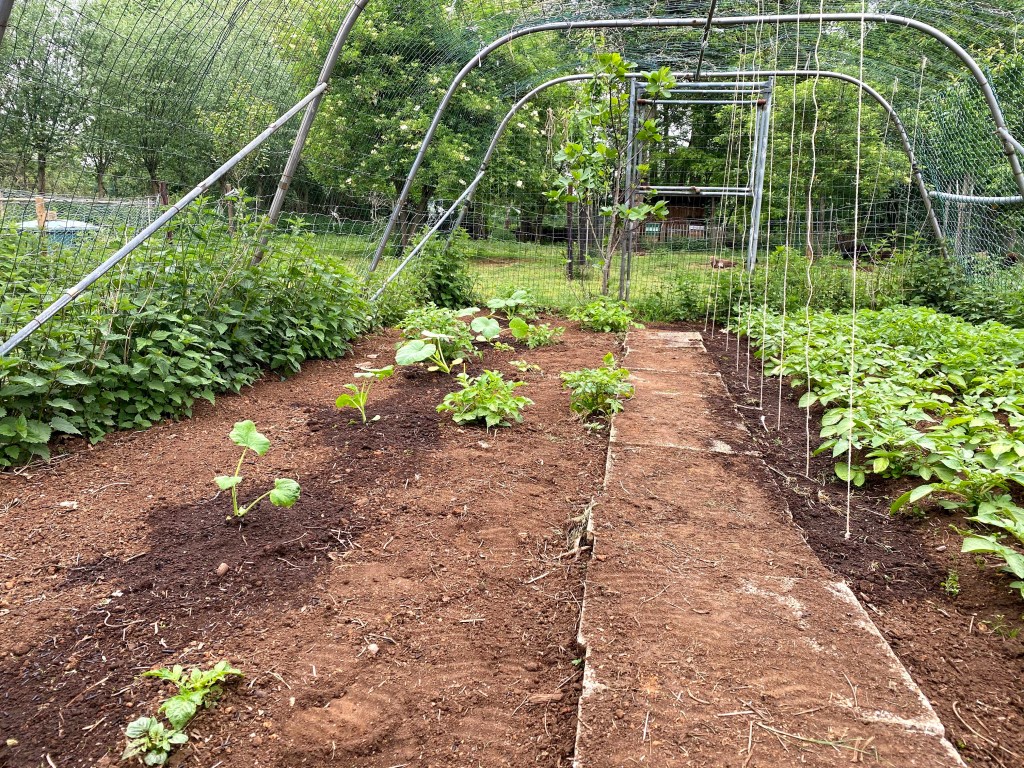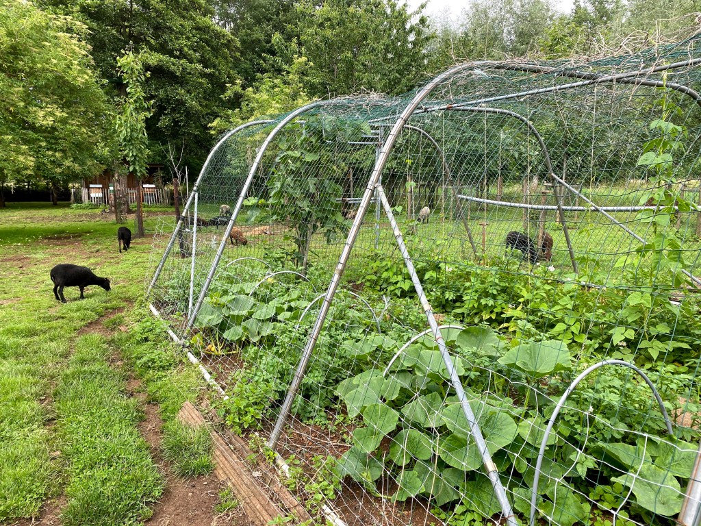 Om de klimbonen vlot te laten omhoog klimmen, gebruik ik al enkele jaren een oude serre die ik met gaas heb bekleed. Ook de pompoenen en de aardappelen worden hier gezet. Wel wissel ik ze elk jaar van kant. Tijdens de winter zaten er enkele kippen in om de grond proper te houden. Begin april gaan er dan aardappelen in de grond en in mei de klimbonen en de pompoenen. De planten staan beschut tegen de schapen- en vogelvraat. De klimbonen groeien tegen een touw omhoog en leggen zich dan op het dak. De plukrijpe bonen hangen dan juist boven mijn hoofd. Ik zet paarse en gele prinsessen, snijbonen en kievitsbonen. Van elk drie hoopjes met vijf bonen leg ik in.