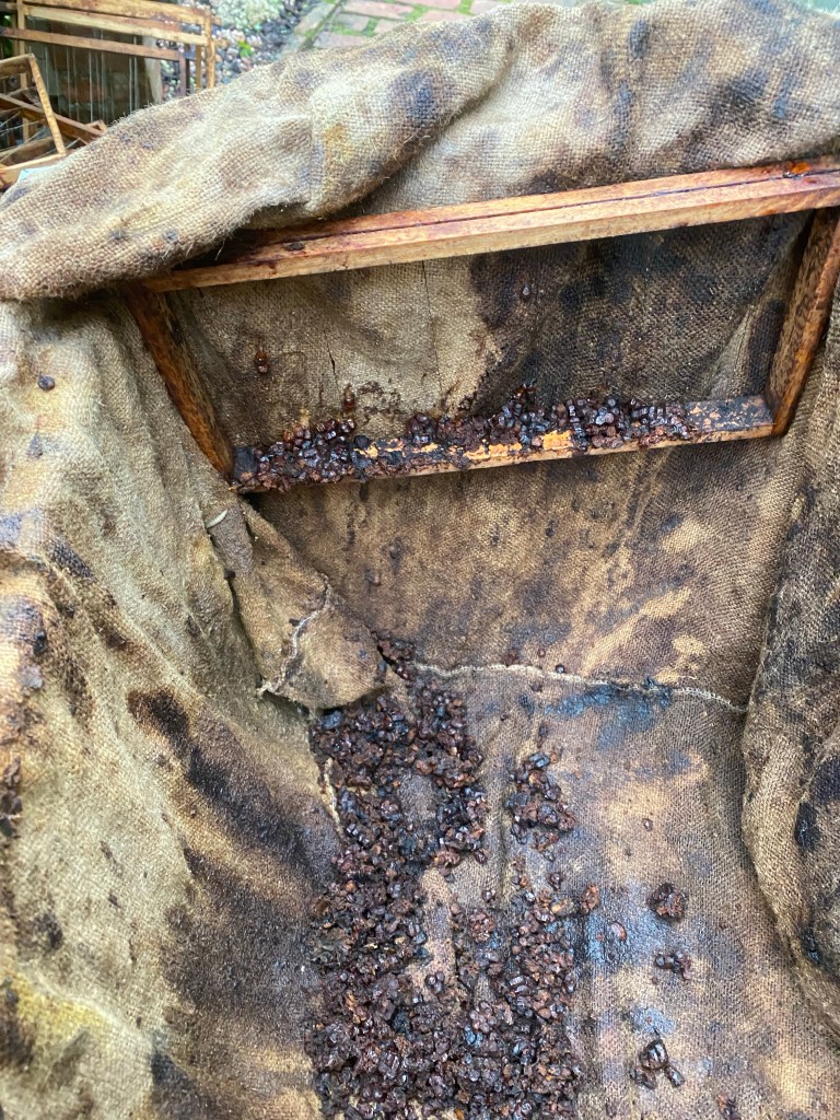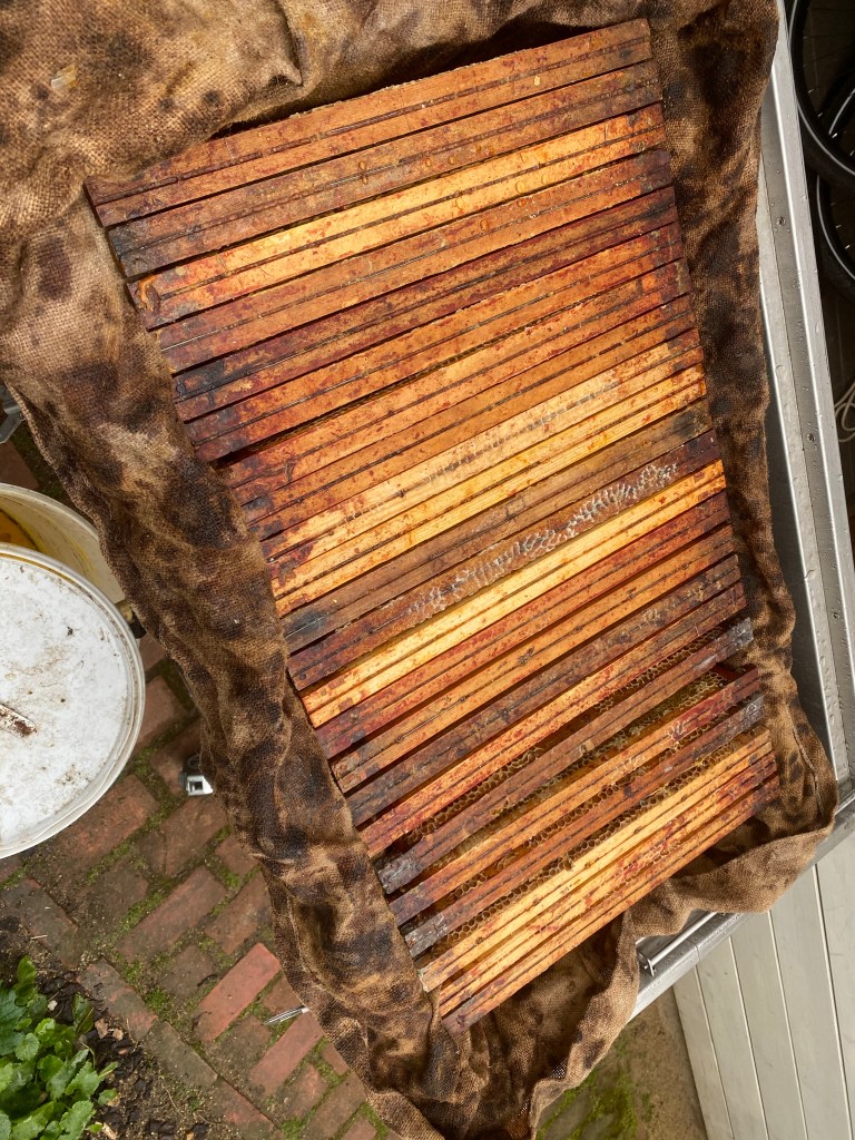 Vandaag begonnen aan het uitstomen van de slechtste honingraten. Honingraten met fouten, zoals opgeslagen stuifmeel of met darrenraat smelt ik nu al. De mooiste zijn opgeslagen tot volgend jaar. Ze zijn eerst 2 dagen in de vriezer geweest om alle wasmotlarven te doden, wellicht gaan ook eitjes van de wasmot op deze manier dood. Ik heb in elk geval nog nooit aangevreten honingramen gehad na een vriesbehandeling. Als ze niet zijn ingevroren en dadelijk in afgesloten containers worden geplaatst, schiet er na de winter niet veel meer over. Dan vieren de wasmotlarven de ganse winter feest in de compleet afgesloten bakken. Bladeren van de walnootboom in de bakken leggen, helpt wel maar zeker geen 100%. En azijnzuur in aparte bakken met telkens 12 honingramen vind ik nogal omslachtig. De diepvriezer draait per slot maar enkele dagen en dat kost ook geen stukken van mensen.