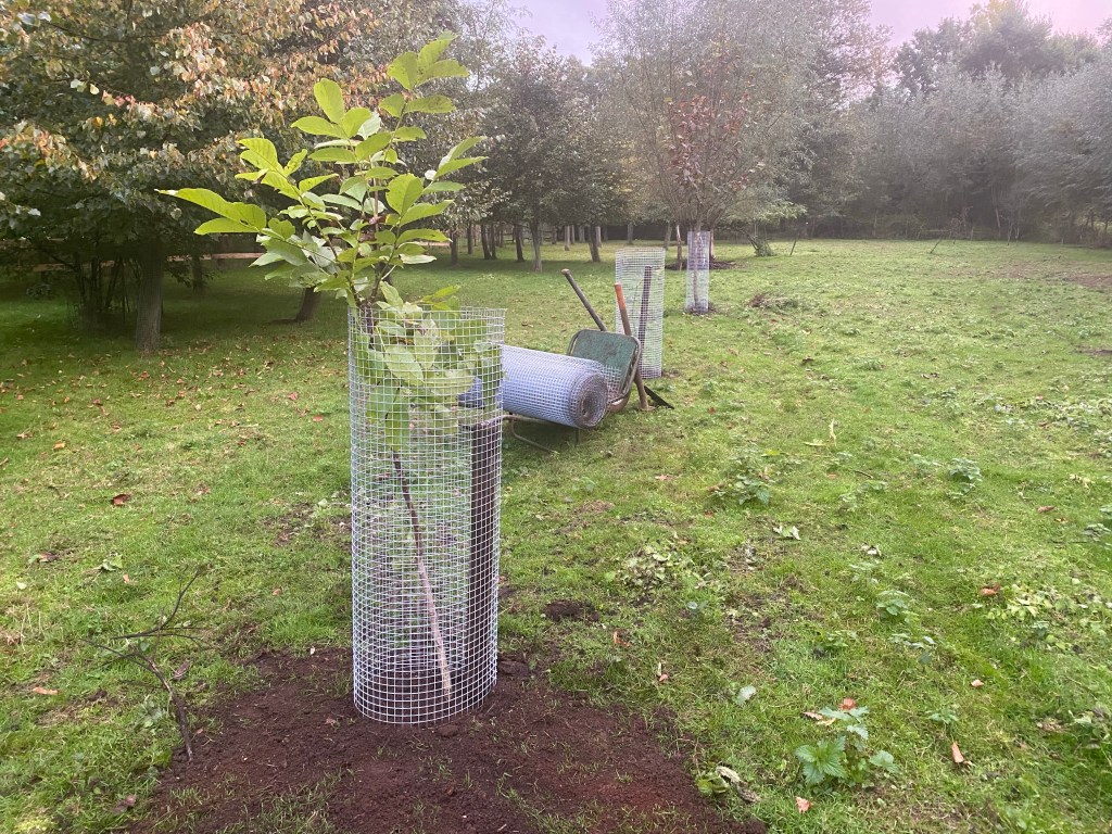 Vandaag enkele nieuwe walnoten geplant. Met een gaas rond de stam om schapenvraat te voorkomen. Het duurt nog wel een tiental jaar alvorens ze bloeien, maar als ze nooit worden geplant, bloeien ze ook nooit. De lindebomen hebben dit jaar ook voor eerst in bloei gestaan. De voorbije tien jaar zijn voorbij gevlogen.