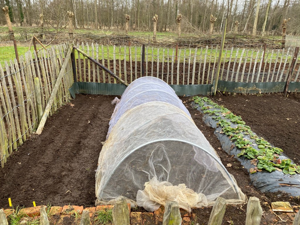 De eerste groentenbedden zijn in gebruik genomen. De uien en sjalotten worden telkens afgewisseld met een rijtje wortelen. Deze gaan prima samen om zowel de uienvliegen als de wortelvliegen te misleiden. Om deze plagen nog verder te bestrijden plaats ik ook elk jaar een insectendoek over het bed. Bovendien maak ik veel gebruik van wisselteelt en komen dezelfde groenten pas enkele jaren later terug op hetzelfde bed.