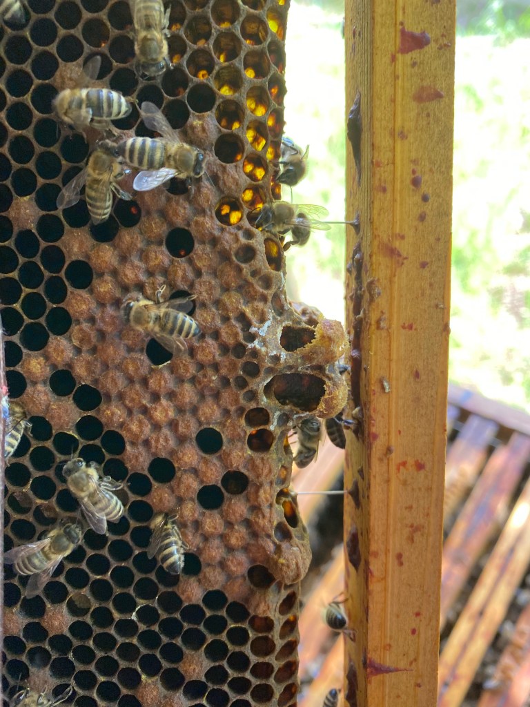 De aflegger zelf waar de koningin in terecht kwam, doet het prima en kreeg al nieuwe wasramen. De andere afleggers kan ik binnen een tiental dagen controleren en behandelen tegen de varroamijt. Ik heb er dit weekend wel een nieuw voerraam bijgehangen. Door het koude weer de voorbije periode was het meegegeven voerraam bijna leeg.