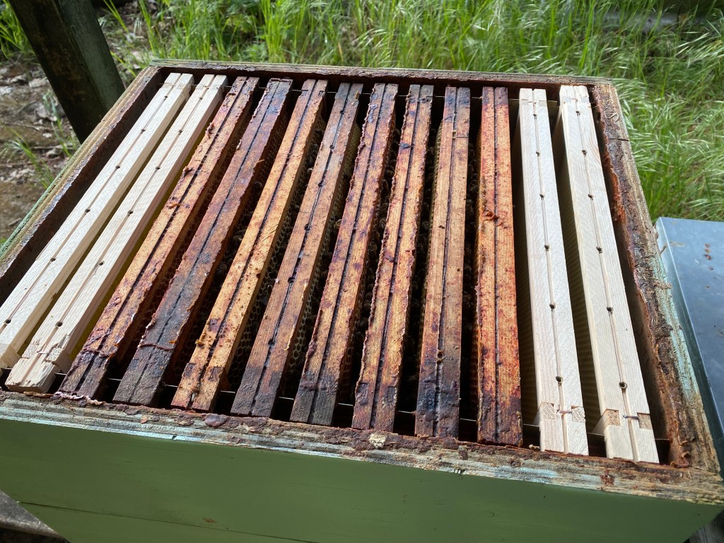 Bij de controle van de bijenvolken vandaag heb ik voor de eerste keer dit jaar verzegelde honingramen mee naar huis genomen. Alleen ramen die volledig zijn verzegeld. Dan is de honing zeker klaar. Het betreft telkens enkele ramen centraal in de bovenste honingbak. Ik schuif daarna de overige ramen naar het midden en geef aan de buitenkant weer nieuwe waswafels. Vandaag had ik zo 27 ramen bij. 27 Kempische honingramen met een relatief vochtgehalte van 18,5 %.
